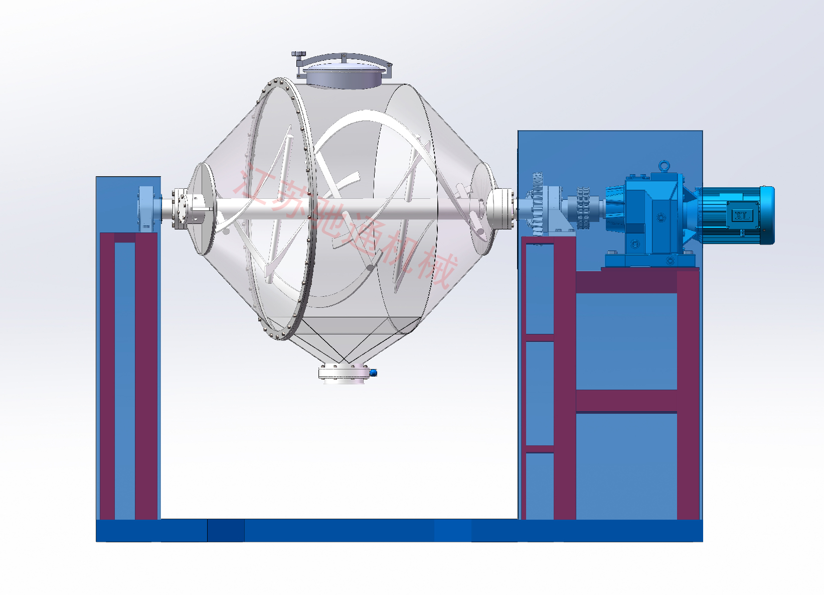 (三)雙錐筒進(jìn)料口采用快開旋開閥,出料口采用大口徑90°旋閥,使用特別方便。