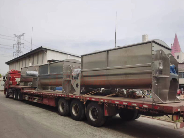 臥式螺帶混合機(jī)由混合倉、攪拌器、驅(qū)動裝置基本組成,U型管狀倉內(nèi)安裝雙層異向螺帶盤繞的攪拌器軸,外螺旋帶在動力的驅(qū)動下,其盤繞形式配合旋轉(zhuǎn)方向把物料從U型倉兩端向中央地帶推動,而內(nèi)螺旋帶把物料從中間向兩端推動,形成對流混合。 混合機(jī)臥式筒體底部中央開設(shè)出料口,外層螺旋帶的蝸旋結(jié)構(gòu)配合主軸旋轉(zhuǎn)方向驅(qū)趕筒壁內(nèi)側(cè)物料至中央出料口出料,確保筒體內(nèi)物料出料無死角。